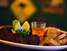 Chicken Tikka Massala (R$ 29): curry de frango marinado em iogurte, servido com arroz pilaf, chutney de manga, pão naan, chutney de cebola e raita.
